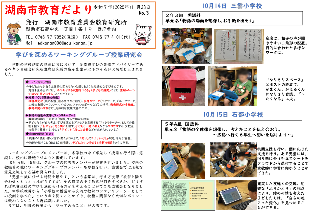 湖南市教育だより 更新日:2025年12月03日 令和7年度 湖南市教育だよりNo.3(令和7年11月)(PDFファイル:651.6KB)(PDFファイル:868.3KB) 湖南市教育だよりNo.2(令和7年10月) (PDFファイル: 651.6KB) 湖南市教育だよりNo.1(令和7年7月) (PDFファイル: 1.1MB) 令和6年度 湖南市教育だよりNo.4(令和7年3月) (PDFファイル: 905.5KB) 湖南市教育だよりNo.3(令和6年12月) (PDFファイル: 869.7KB) 湖南市教育だよりNo.2(令和6年9月) (PDFファイル: 705.7KB) 湖南市教育だよりNo.1(令和6年4月) (PDFファイル: 658.2KB) この記事に関するお問い合わせ先 教育部 教育研究所〔西庁舎〕電話番号:0748-77-7052ファックス:0748-77-4101メールフォームでのお問い合わせ