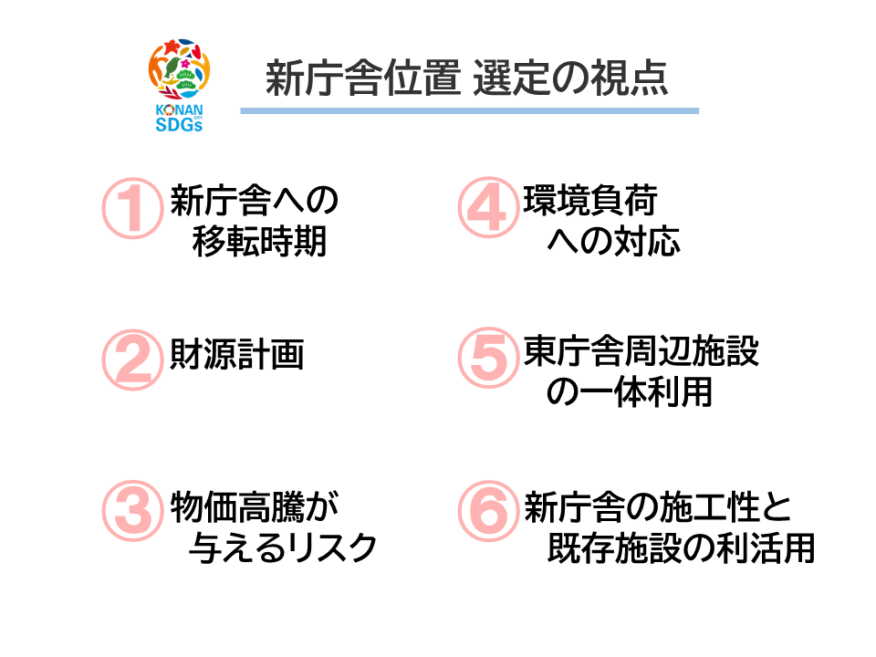 そのために、「防災」「財源」「物価」「環境」「まちづくり」「施工性」という6つの視点により、3つの案から新庁舎の建設場所について総合的に検討し、建設場所を現東庁舎の南側駐車場に決定いたしました。