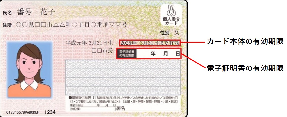 お持ちのマイナンバーカードの本体の有効期限、電子証明書の有効期限を確認いただき、該当する人は更新のお手続きをお願いします。(それぞれの有効期限については、下記カード見本の赤枠部分で確認できます。)