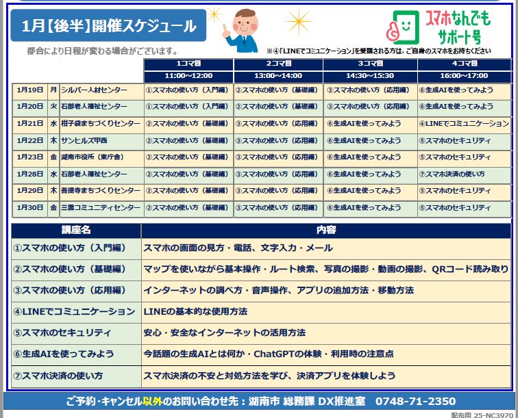 内容:スマホの使い方(入門編、基礎編、応用編)、スマホの詐欺対策 など